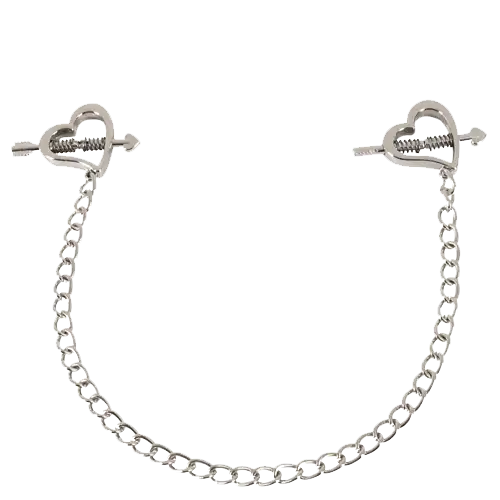 Bittersweet pain in a piercing arrow and heart shape! These Heart shaped nipple clamps pinch the nipples and decorate his or her chest area with a cool stainless steel chain. The stainless steel clamps consist of a stylish heart and two spring-loaded pins in an arrow design that meet in the middle of the heart. The pins can be pulled apart so the nipple can be placed between them. After that, they are released again. The elegant clamps then pinch the nipples in a very stimulating way.