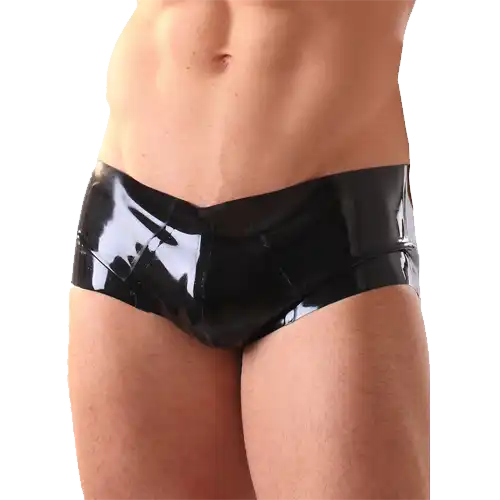 Simple sexy hipster boxer shorts in classic black rubber with seamed pouch at front. Wear as naughty underwear or as a daring outfit for the clubs.