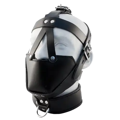 The Mister B Premium Muzzle Head Harness is the most effective and stunning looking muzzle we have ever made. A fitted comfy padded mouth piece cups the jaw and covers the mouth, but leaves the nose open for easy breathing. The padded muzzle muffles any sound your sub tries to make. Because of its comfort and breathing access, this muzzle head harness is great in use in a long term or even overnight session. When worn over another hood, this muzzle greatly adds to the enclosed feeling, making this muzzle a first class mind fucker. The padded mouth piece is held in place by 5 sturdy saddle leather straps, each one adjustable with a buckle, so this muzzle fits just about anyone’s head. The collar is also padded for extra comfort and features an extra D-ring so you can attach a leash. The extra D-ring on top of the head is not suited for suspension, but quite handy as extra attachment point.